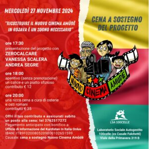 Un progetto che si realizza per gli abitanti della città e dell’intero Rojava. Sarà il primo cinema del Paese, un cinema nuovo, a riportare la vita nel luogo dove il vecchio stabile fu distrutto, nel 1960, da un incendio. Lì dove persero la vita centinaia di bambini e bambine, vogliamo ricreare un polo di produzione e fruizione culturale, lì a pochi kilometri dal confine della dittatura Turca e nel cuore della guerra permanente della Turchia contro il Rojava. Un progetto concreto che sa di futuro, promosso dalla Comune del Cinema del Rojava, collettivo di cineasti che dal 2015 lavora per promuovere le arti visive nella regione autonoma del Rojava, nel Nord-Est della Siria. In Italia la campagna per la ricostruzione del Nuovo Cinema Amûdê è promossa da Ya Basta Bologna ODV in collaborazione con Un Ponte per, ARCI e UIKI Onlus.